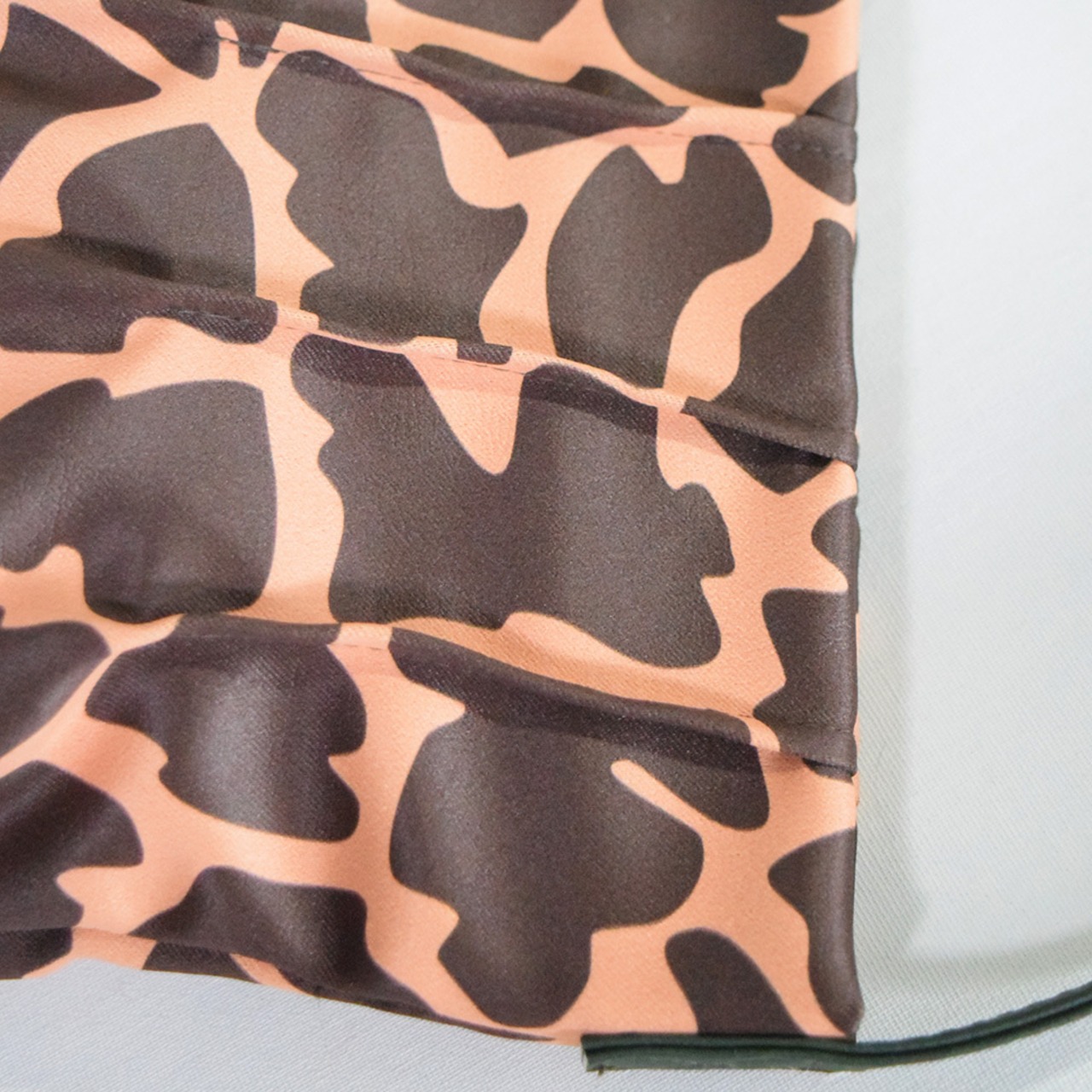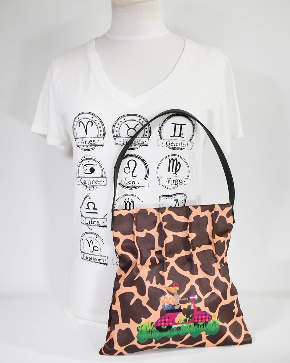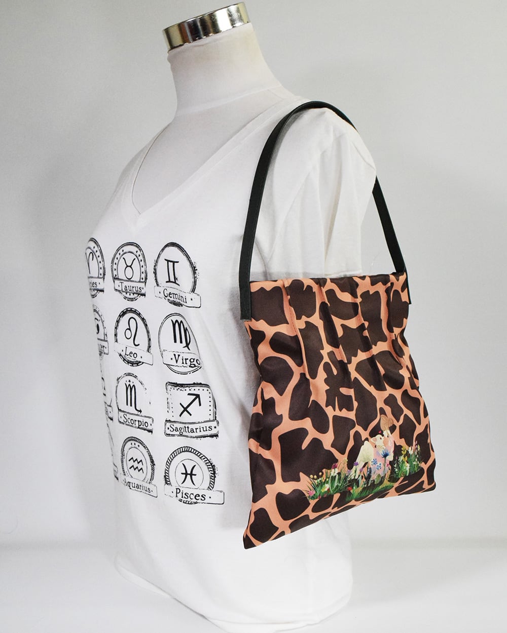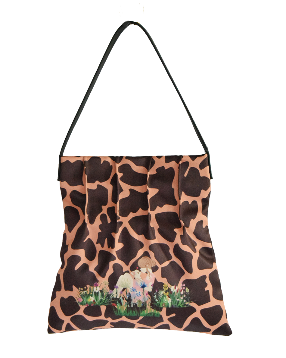 サテン素材にプリントすることで革にも近い表情があり、ジラフ柄にアクティブな女性とかわいい女の子をプリントしたアイキャッチ抜群なバッグです。