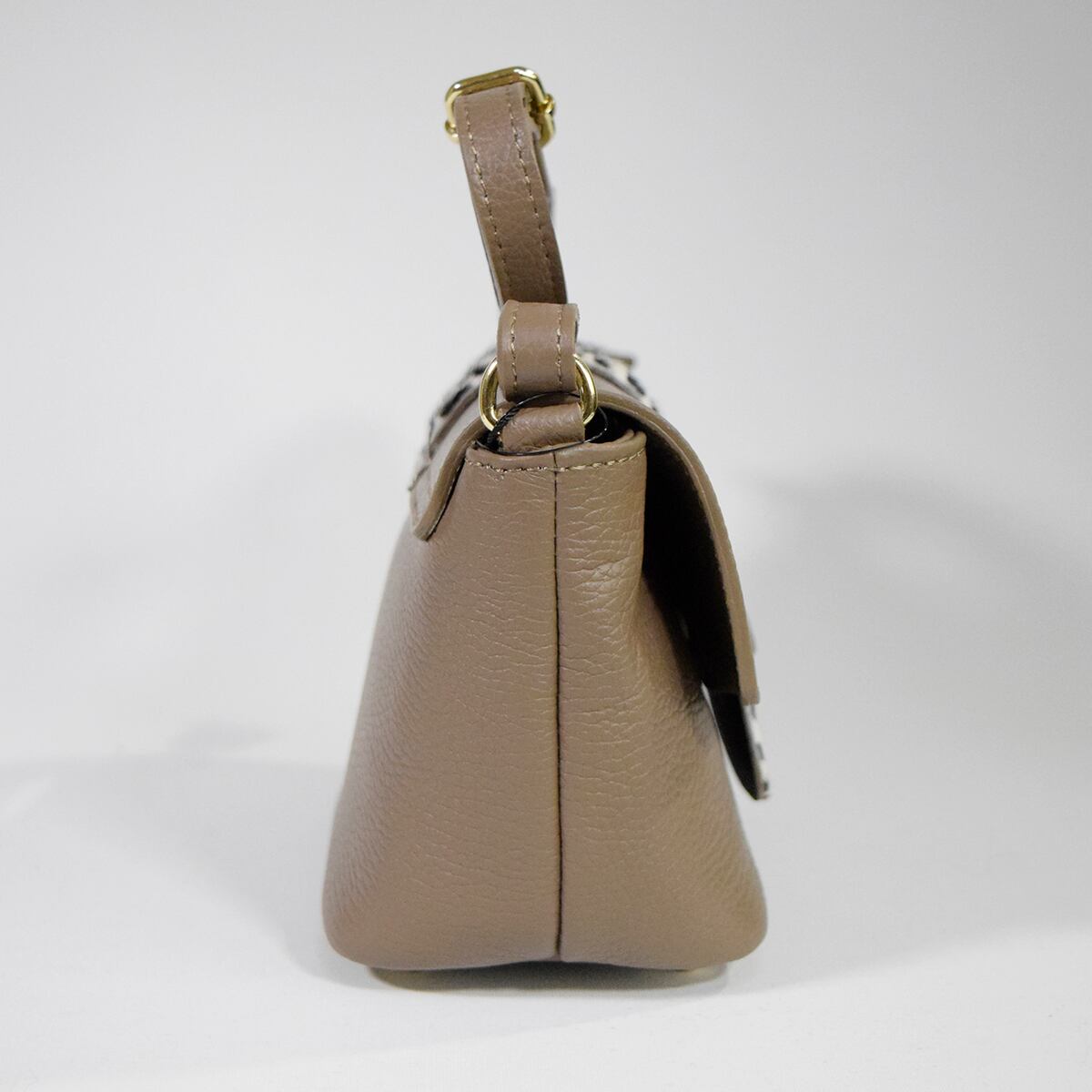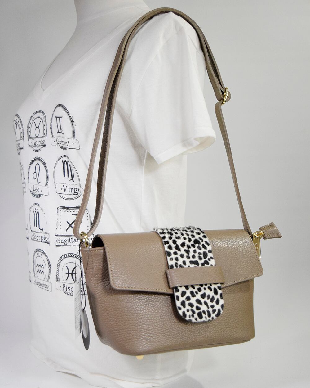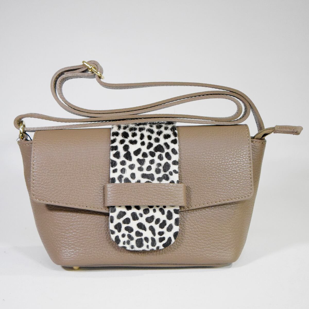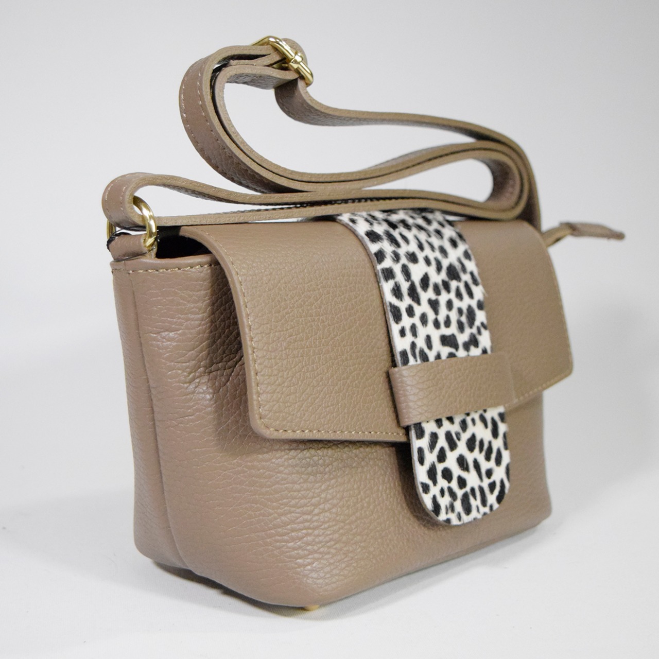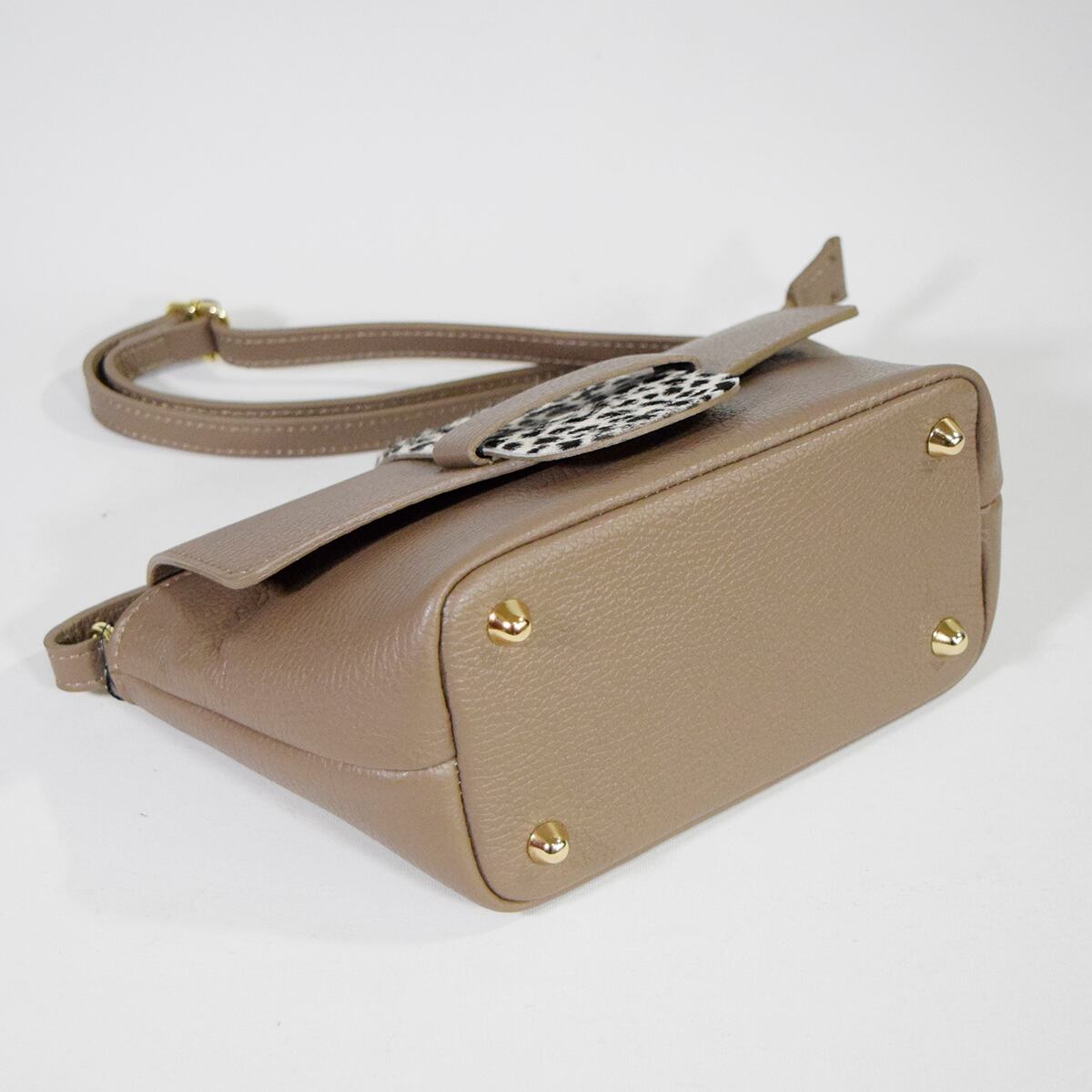 M ROSE 牛革シュリンク牛毛ダルメシアンプリントフラップショルダーバッグ ベージュ