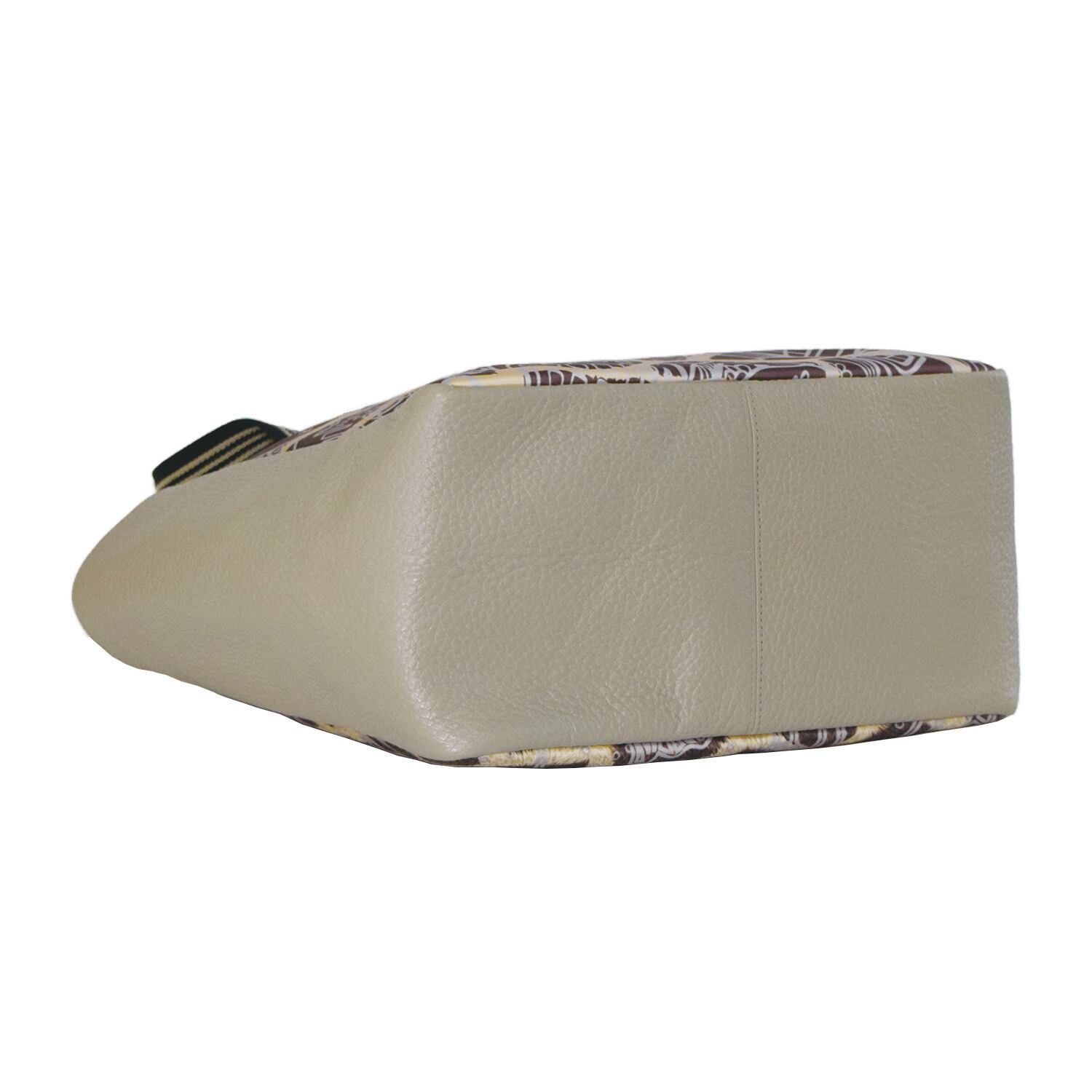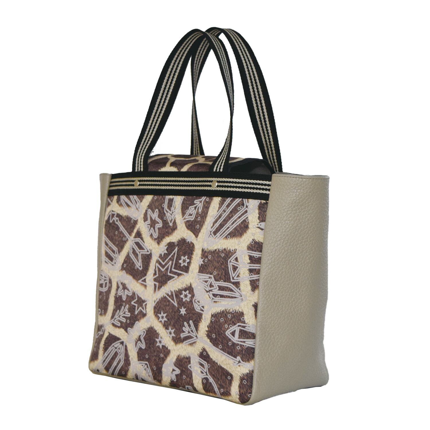 ティピィカレン牛革フラップ付きジラフ柄トートバッグ。