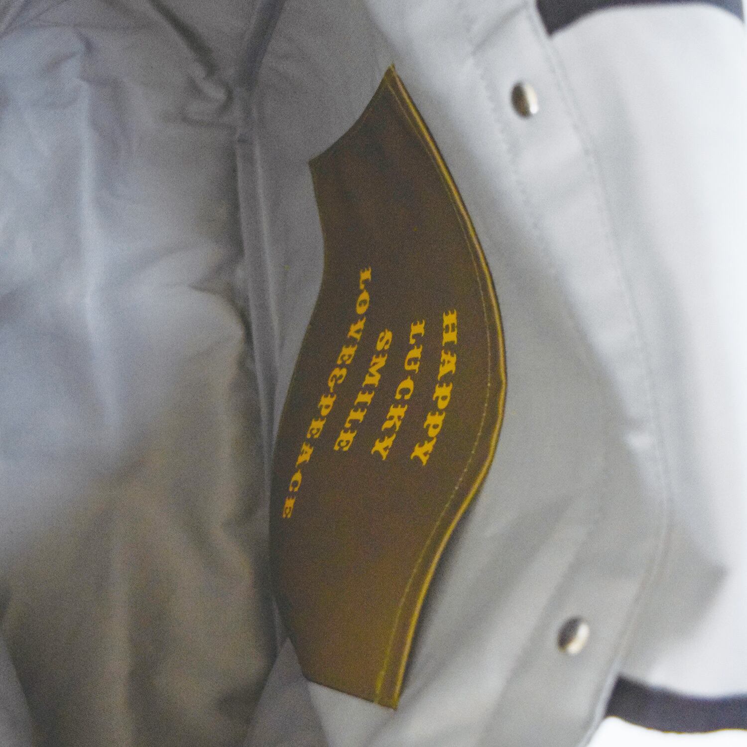 裏地はコットンで切ポケットを2個付け、幸せワードをデザインし楽しくなるバッグを目指してます。