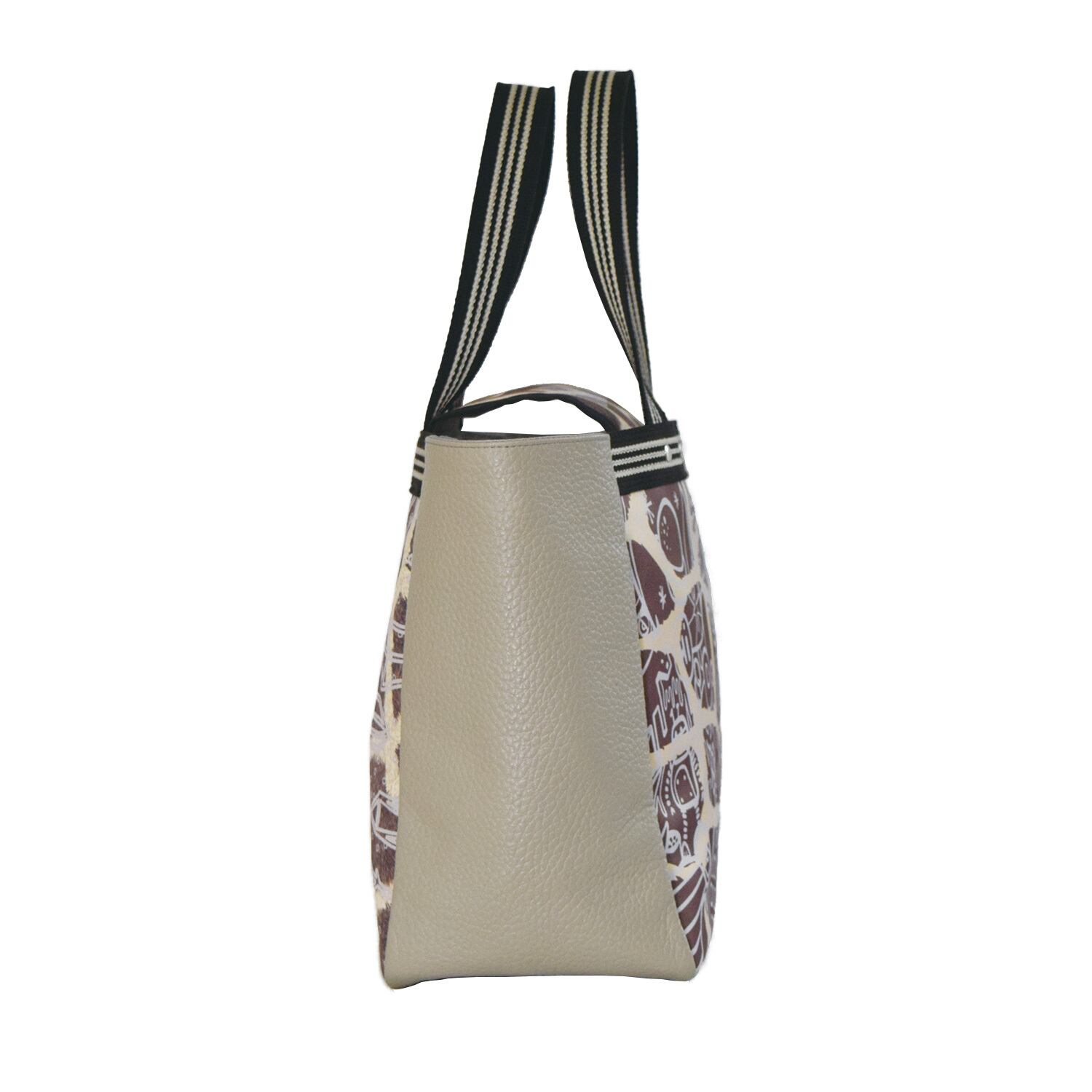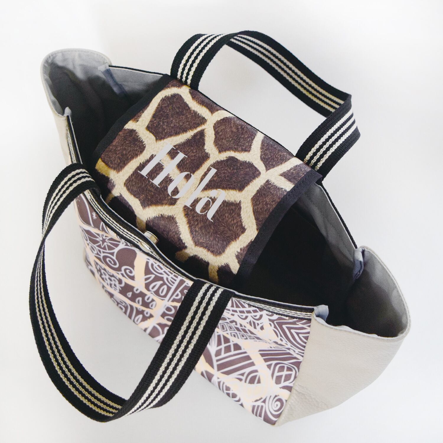 おしゃれなトープ色で、傷のつきにくい牛革のシュリンクは高級感もあり、両面にジラフ柄の遮光スエードが本物感を出しながら高級感をプラスしています。底マチも広くいっぱい入るデザインですので、中の荷物を少しでも隠せるようにフラップをつけています。マグネット止めで、ワンポイントにHolaロゴをプラスしてます。