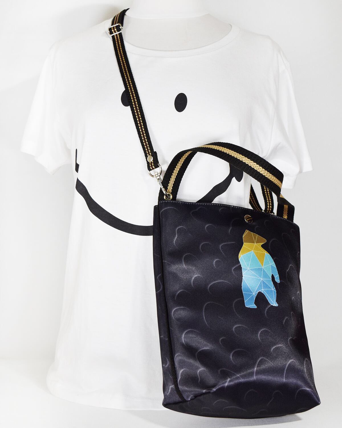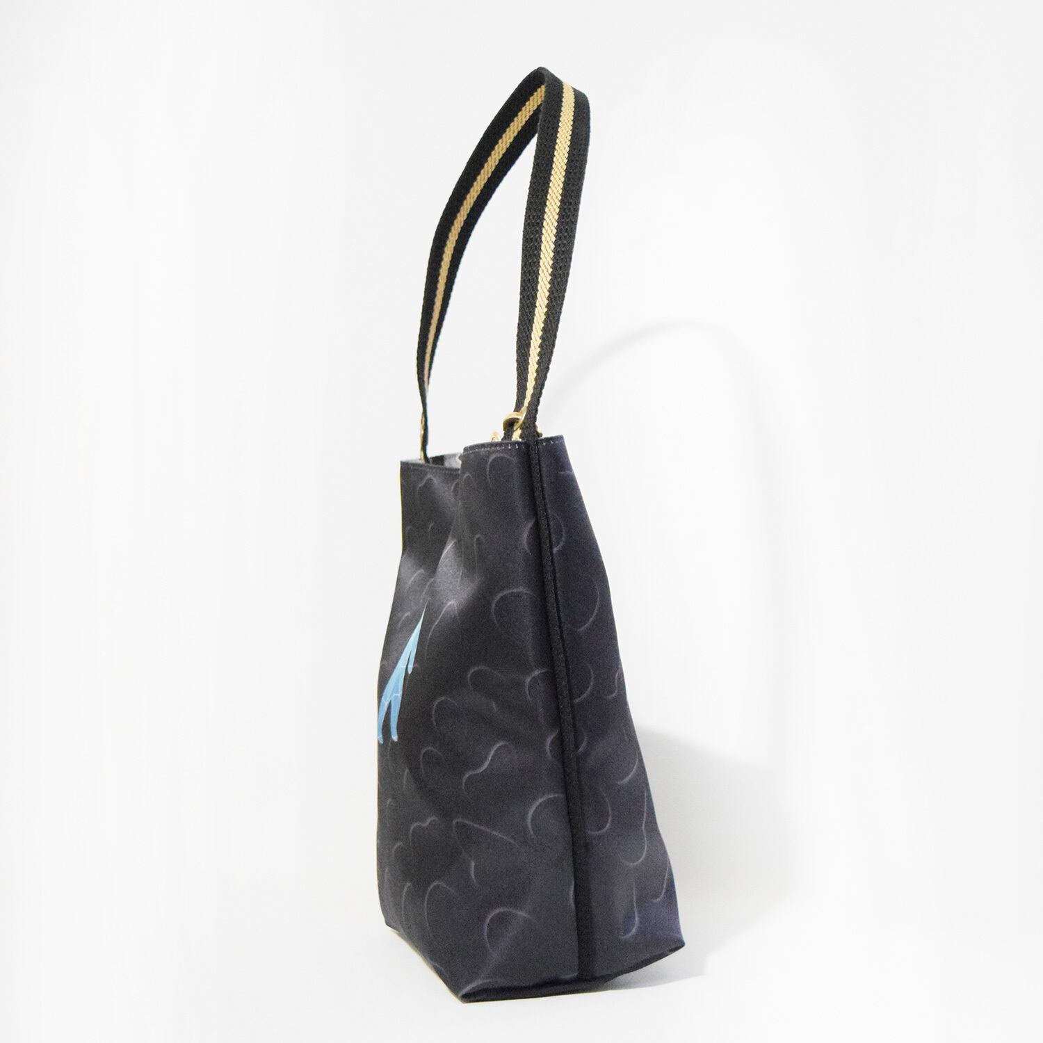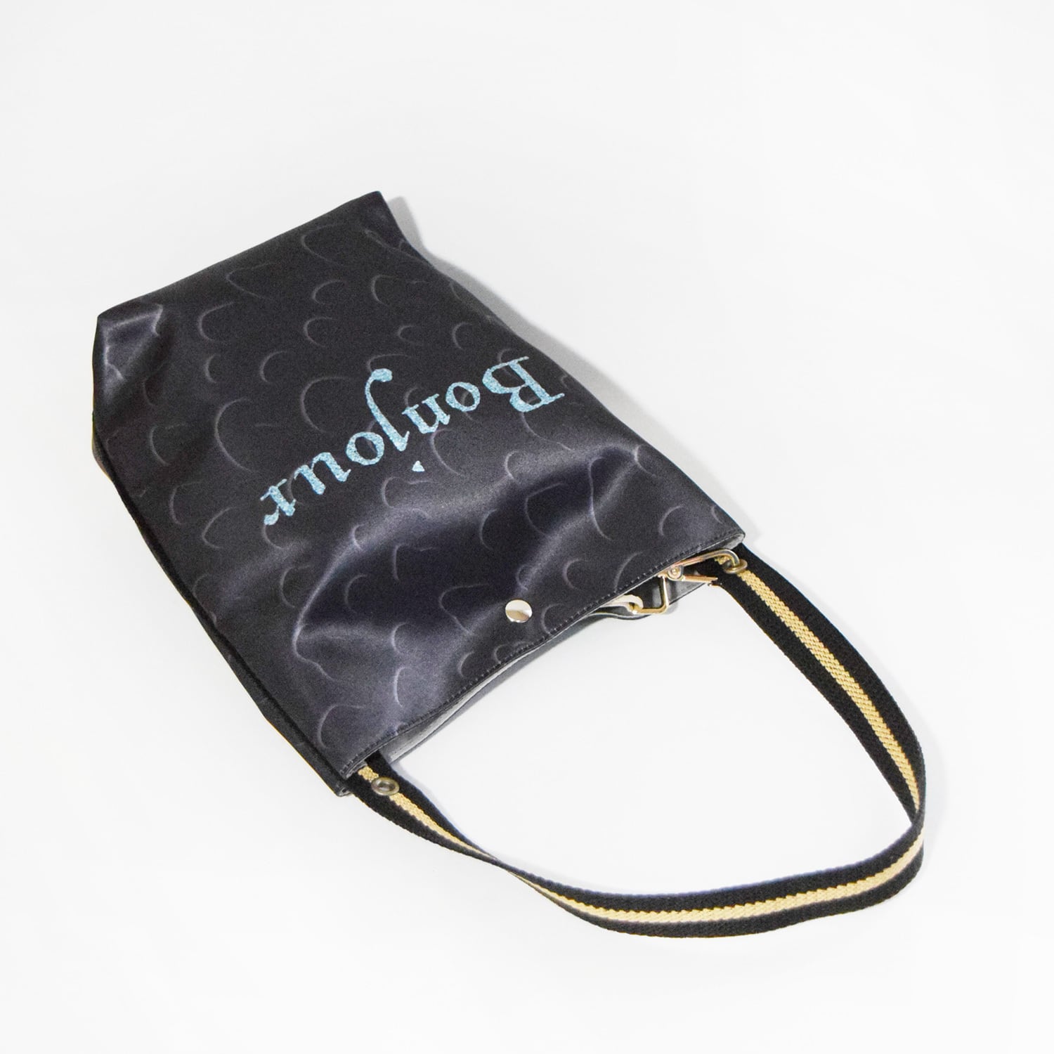 ブラックのベースに同色のダルメシアン柄をプリントし、片面は折り紙風ベアプリント、もう片面はBONJOURをラメ風プリントでワンポイントにしています。